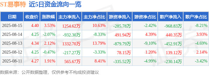本站消息,截至2025年8月15日收盘,ST易事特(300376)报收于4.4元,上涨3.53%,换手率1.16%,成交量27.07万手,成交额1.18亿元。
